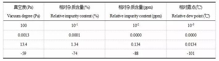 表1 真空度和相對(duì)雜質(zhì)含量及露點(diǎn)